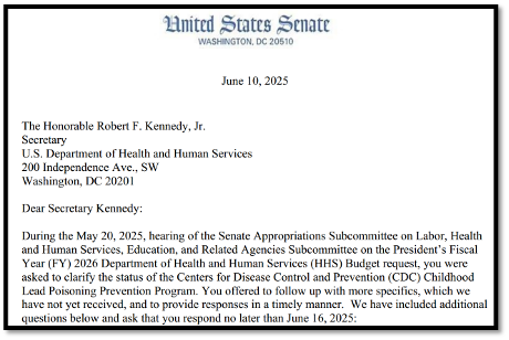 On May 20, Secretary Kennedy in testimony to the Senate Appropriations Committee responded to questions about the CLPPP from Senator Tammy Baldwin (D-WI) and Senator Jack Reed (D-RI). Secretary Kennedy said HHS was “continuing to fund the program”1 and that it would spend the appropriated funds. He testified that “my understanding is that that program is continuing” and he would talk to Senator Reed further.2 He also committed to Senator Baldwin that he and his staff would respond to requests for information from her or her staff.3